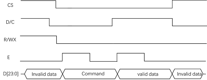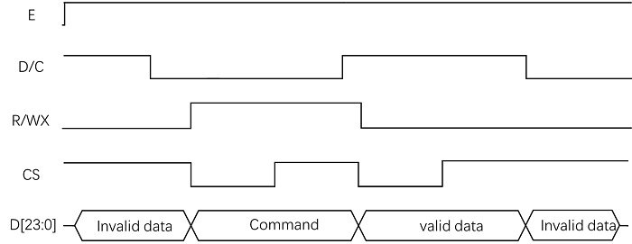 - E 作为时钟信号,上升沿主控发出数据,下降沿屏端采样数据。