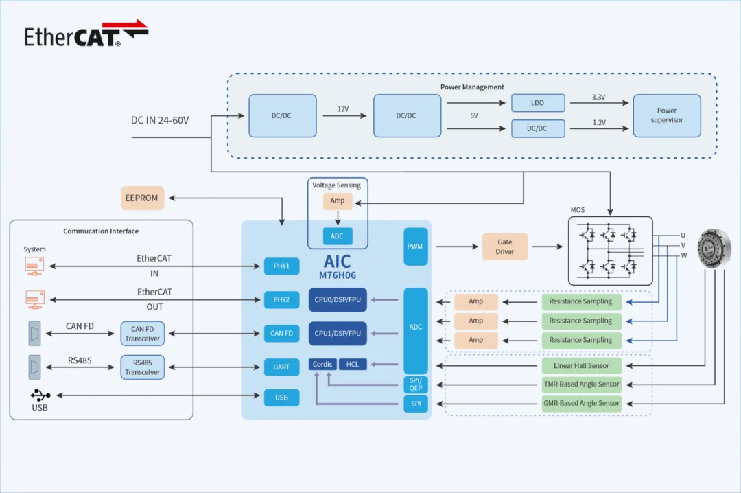 该方案主芯片集成2个工业级PHY,支持1路片外PHY,适合小体积应用。1MB SRAM与2MB Flash,配合硬件加速器与硬件电流环,算力强劲。支持21磁极多向充磁、GMR角度及TMR 24位离轴磁编码器,兼容EtherCAT、RS485、CAN FD等总线,支持在线升级及CiA402协议(CSP/CSV/CST/HM)。