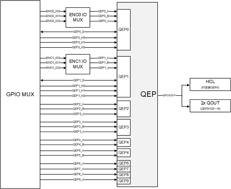 QEP0 的输入信号包括 QEP0_A、QEP0_B、QEP0_I、QEP0_S、QEP0_H0、QEP0_H1 和 QEP0_H2 信号,其中 QEP0_A、QEP0_B、QEP0_I 复用于 ENC0 IO MUX 模块,需通过 SYS_CFG 配置寄存器 ENCODER_CFG 进行选择。而 QEP0_S、QEP0_H0、QEP0_H1 和 QEP0_H2 信号则直接通过 GPIO 复用选择;