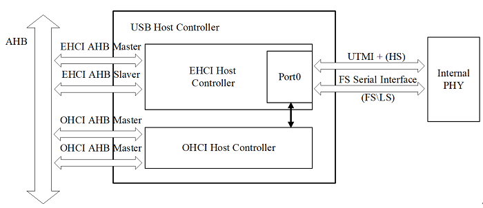 USB Host Controller 模块内置 EHCI 和 OHCI Host Controller,内置 USB PHY,兼容 USB2.0 和 USB1.1 协议,支持 HS/ FS/ LS 设备。