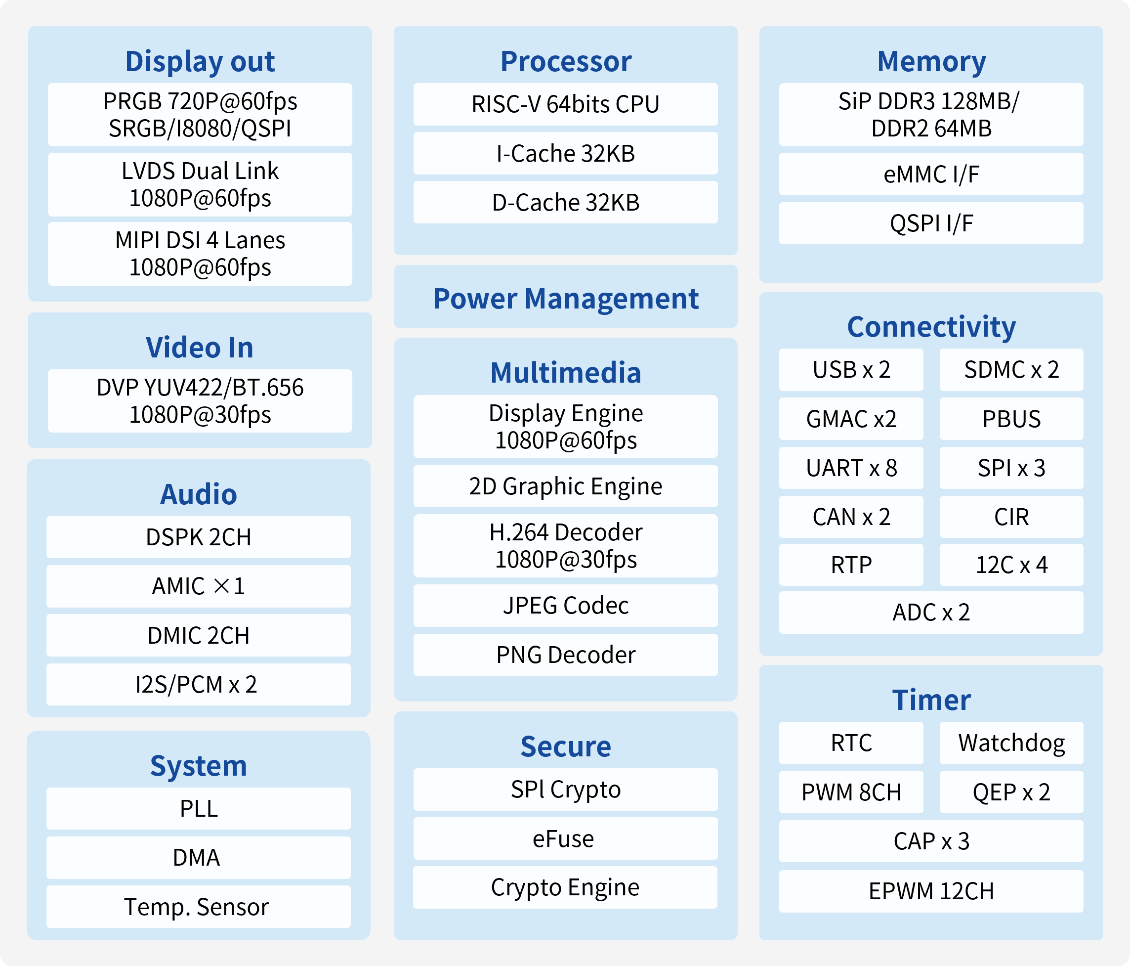 D21x系列是一款高性能的全高清显示和智能控制SoC,采用国产自主64位高算力RISC-V内核,内置16位DDR控制器并提供丰富的互联外设接口,配备了强大的2D图像加速引擎和H.264解码引擎,在MJPEG及PNG解码加持下,可以满足各类UI交互设计场景和多媒体互动的流畅体验,完美对接QT、LVGL及AWTK等UI图形框架。D21x系列支持工控宽温,具有高可靠性、高安全性、高开放度的设计标准,可广泛应用于工业自动化控制,人机界面HMI、物联网关、智慧家居和智慧工业等领域。