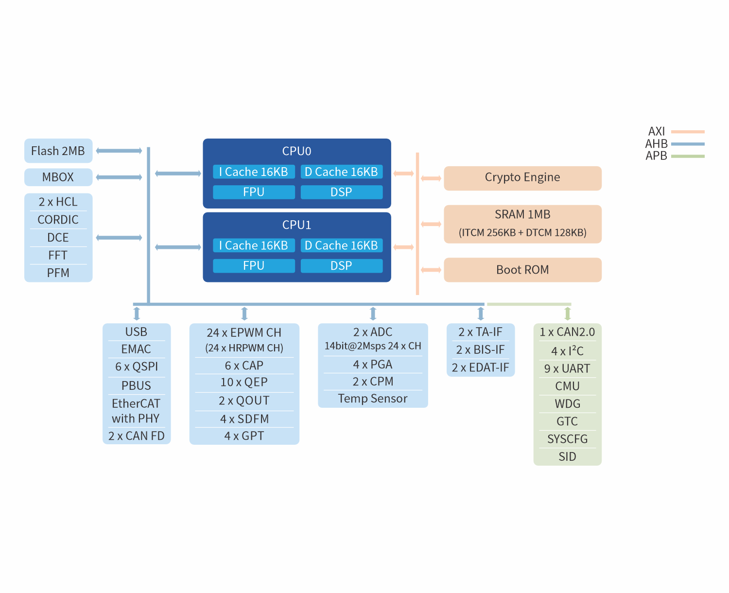 大容量SRAM(1MB)与Flash(2MB),I/D-TCM最大可配置256KB/128KB。